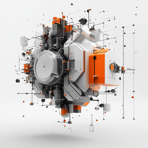 Draw an life-like object from extrusions in grayscale and white background with tint of orange in 3d format suitable to depict advancement of technology or future technology.