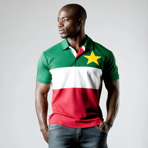 Design a men's polo shirt fully covered by the provided flag, worn by a black man with an athletic build. The top of the polo should feature the green band running horizontally across the shoulders and collar, followed by a thin white stripe just below it. The middle section should be dominated by the wide red stripe, with the prominent yellow star positioned in the center of the chest. Beneath the red section, a second thin white stripe should run horizontally, followed by a green band wrapping around the lower part of the polo. The design should follow the exact sequence of green, white, red with the yellow star, white, and green, wrapping seamlessly around the front, back, and sleeves, including the collar. The vibrant colors--green, white, red, and yellow--must be bold and clear, with the red section being the most prominent. The polo should have a fitted yet comfortable style, perfect for both casual and semi-formal occasions.