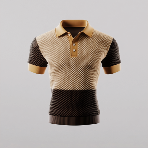 make a 3D image of a mens polo. make the fabric textured jaquard. Make the image look realistic and floating in the air. Make the dark tan, black, and light cream. Make this look photo realistic. Make the background pure white. Make the polo look like its from the 50's. make the polo a oversized in the body.
