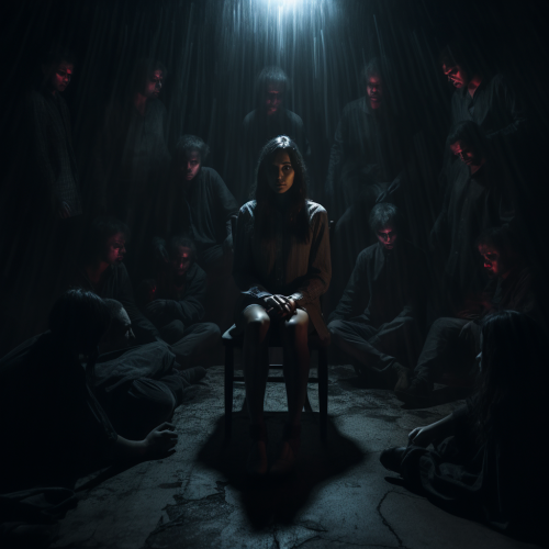 a woman sits in a dark place surrounded by barely seen dark menacing figures ar 16:9