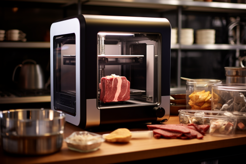 a realistic image of a 3d printer in a factory with a grayish bluish tone --ar 16:9