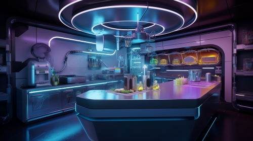 A futuristic kitchen in a spaceship, high-tech metallic walls with holographic control panels, floating utensils and containers, an otherworldly glow emanating from the central food processor, a sense of efficiency and innovation, 3D rendering, ray tracing with neon lighting, --ar 16:9 --v 5.0