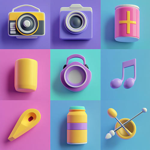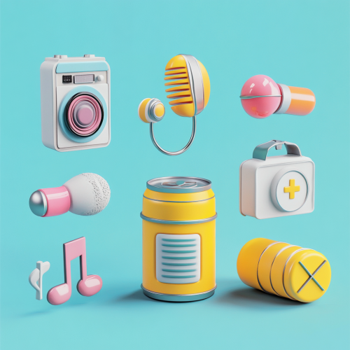 a series of icons of Polaroid, medicine bottle, musical note, microphone, and ring-pull of can, Blender 3D style, high resolution, exquisite, gorgeous, and simple solid color background