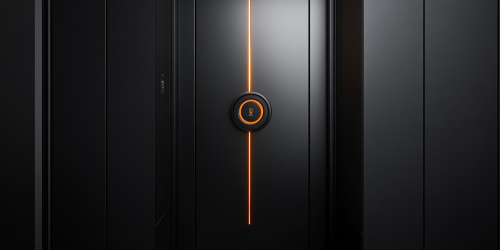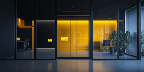 High-resolution image of a tech office 'door' with push and pull indicators for the employees to watchout in yellow. The background is black and clean. The design is modern and clean, with a tech-centric, digital theme --ar 2:1