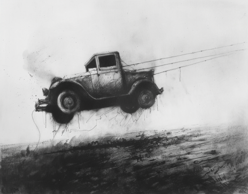 A charcoal drawing of an anthropomorphic car being pulled down in the style of Zdzisław Beksiński, Alfred Kubin, Francisco Goya, Paul Rumsey --ar 32:25 --v 6.0