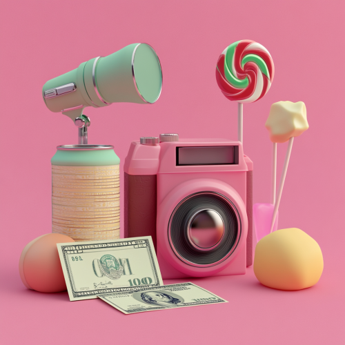 a series of icons of Polaroid, a stack of cash, microphone, lollipop, and can pull tab, Blender 3D style, high resolution, exquisite, gorgeous, and simple solid color background;