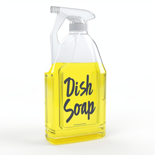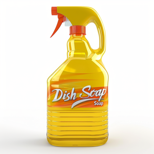 liquid detergent with "Dish Soap" written on it, plastic bottle, push pull cap, yellow liquid detergent inside it, really long bottle, 3d, white background