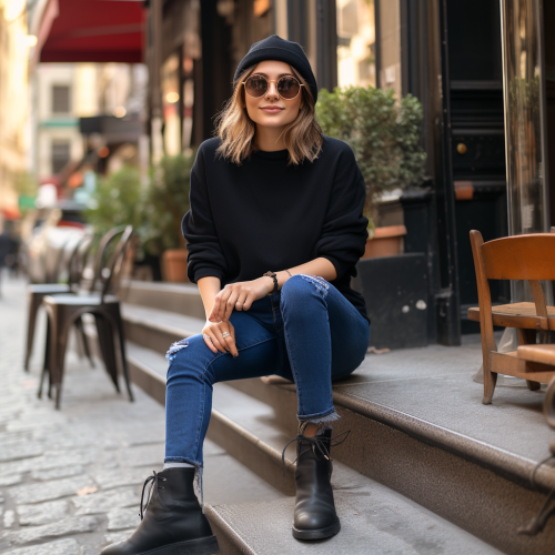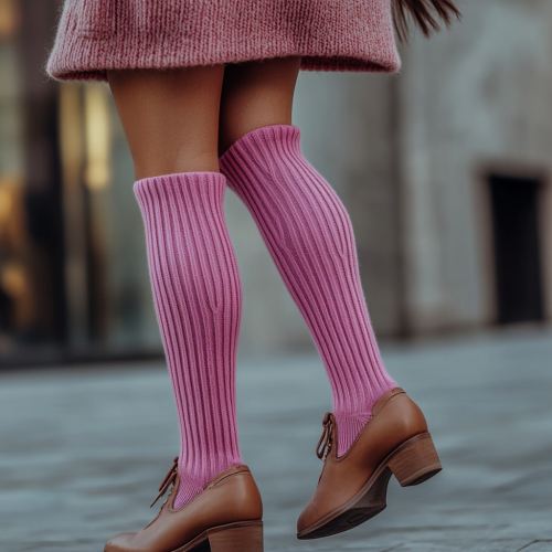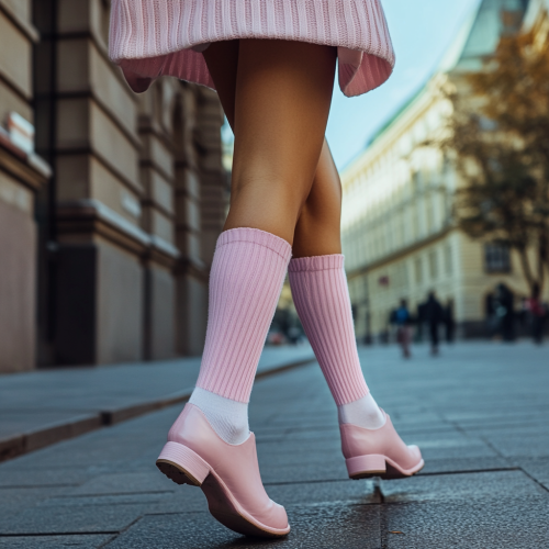 a young woman wears pink woolen short socks and walks down the street. The short socks are smooth in structure and have a woolen weave structure. Elegant and fashionable shoes
