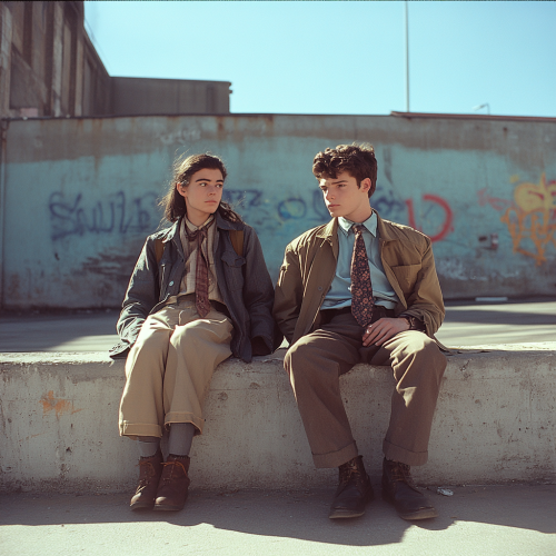 1994, Wes Anderson style, nerdy teenagers sit on a concrete wall in an industrial space, one teenager wears a blazer shirt and tie, flat space photography, color film --ar 3:2 --style raw --s 250