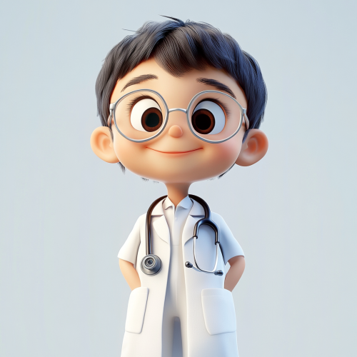 white background, object oriented, 3d animated character, child, cheerful, clinic, doctor, gown, horn-rimmed glasses, healthy, unreal engine, 3d graphics, 4k