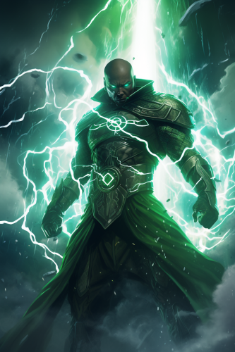LitRPG Book cover: greek warrior in shaolin inspired futuristic clothing on a battlefield. Green lightning lights the sky and hit a fractal forcefield protecting him. --ar 2:3