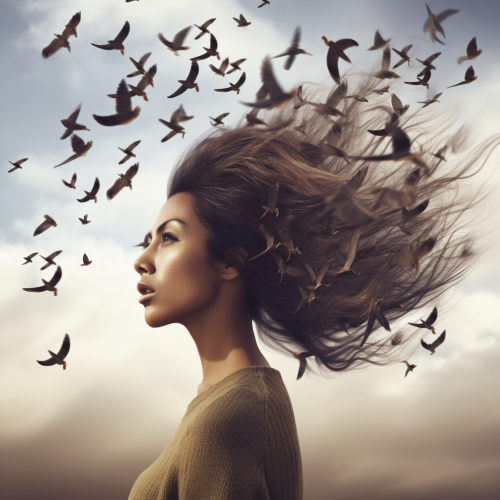 beautiful woman wind birds coming out of her hair --v 5.0 --s 50