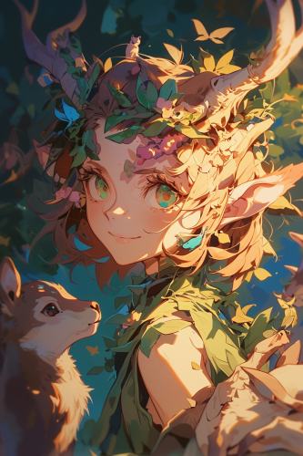 anime drawing, adrogynous satyr, in the fairy forest surrounded by animals, nature magic, expression happy, close-up intensity, masterpiece, best quality, ultra-detailed, cinematic beautiful lighting, intricate details, looking at viewer, depth of field --ar 2:3 --stylize 200 --niji 6