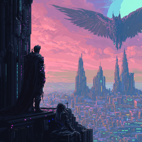 a dark lord and an angelic overlord looking over a futuristic cyber punk city in the digital realm, pixel art, vivid colors, high definition, many details, vast landscape
