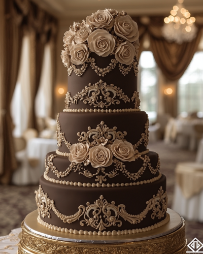 Create an exquisite and stunningly beautiful wedding cake design. This cake is multi tiered barrel shaped and very tall Victorian design inspiration. The base color is chocolate buttercream. Royal Icing and filigree and Paisley and swirl designs. The cake sits on a gold pedestal cake stand on a dessert table in a ballroom.The table has ruffled tablecloth. There are beautiful layers of swag curtains. There is excellent lighting on the cake and the room. --ar 4:5 --v 6.1 --stylize 500