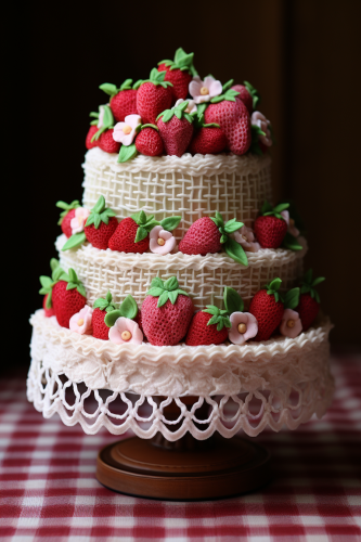 Create a beautiful and festive tall square multi tiered Christmas themed cake. The cake base is white fondant. Gold Royal icing filigree and paisley and swirls designs. Baby red and white roses. Spruce pine tips. Small red poinsettias. Holly leaves and berries. Gold and red shiny baubles. Candy cane swirls lollipops. Red ribbon bows. Thin fondant swags. Buttercream icing. This cake sits on a tall pedestal cake stand in gold. This is a Christmas wedding and party at a banquet hall. There are spotlights on the cake and curtains in the background. --ar 4:5 --v 6.1 --stylize 500