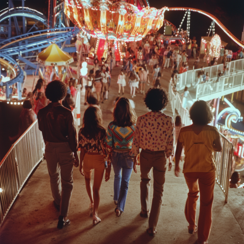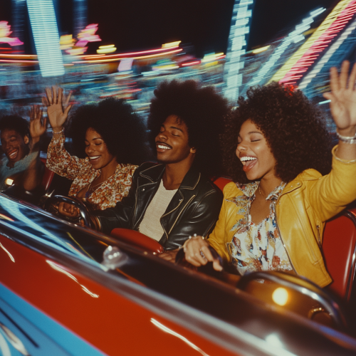 A nighttime scene at an amusement park, captured from a front diagonal angle showing a group of friends and other riders on a brightly lit rollercoaster. The riders, a diverse blend of races, are dressed in 1970s style with afros, leather jackets, and vintage hairstyles. Women have 70s-inspired hairdos, adding to the nostalgic feel. The rollercoaster cars are moving fast, with the riders’ hands in the air, smiling with excitement. The track extends behind them, illuminating the background with vibrant, colorful lights that reflect off the metal structure. Motion blur enhances the sense of speed and thrill, while the scene remains ultra-crisp and clear, captured in a modern 2024 style with Kodak 8K resolution and a 9:16 aspect ratio. The photo blends a 70s aesthetic with sharp, high-quality detail, immersing the viewer in a nostalgic yet intensely vivid night at the amusement park, full of happy, lively energy.