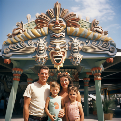 70's photography polaroid disposable camera of a family front of a googie pavilion with tiki ornements , wide shot, 24mm lens, HD, 8x10 film, intricate details, ultra realistic, highly detailed, cinematic, kodachrome, kodak color film, cinematic, film grain, ultra realistic, 8k, photo realistic, full shot, centered, full shot, hyperrealism, hyperrealistic, shot on panavision, full shot, cinematic style, hyperrealistic, highly detailed 4k color cinematic production still, shot on large format film.