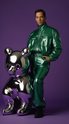 1990s scene portrait of Jeff Koons in a metallic green jumpsuit featuring inflatable purple aubergine motif and a mirrored helmet, fashion movie scene Balenciaga commercial --ar 9:16