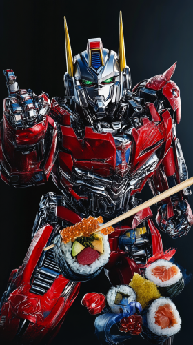 Fighting and attacking with chopsticks TRANSFORMER'S Optimus prime, portrait with sushi rolls and otaku vector Akira Toriyama style downtown tokyo 3D chrome --ar 9:16