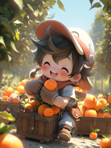 Blind box style, realistic PVC texture. delicate lusterchibi, with trees as the main elements,a man in farm clothes is carrying a basket of oranges,and there are many clouds in the blue sky, and the warm sunshine is shining on the side face. top view, 3d render, OC render 3d model, blender, super detailed, 8k--niji 5 --ar 3:4 --s 400 --niji 5