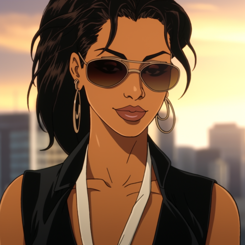 DVD screengrab, 90s anime movie, with brown tan skin cute anime character, beautiful woman, 30plus, rich, cocky, sunglasses, cocktail dress, moody, unimpressed, faint smile, perfect super model, wearing modern branded clothing, fancy, perfect face, perfect smile, perfect makeup, high quality anime screencap, 8k resolution, sciencefiction fantasy battlesuit, bleach-like, 90s anime, VHS anime, comic art, high class, unapologetic grit, --v 5.2
