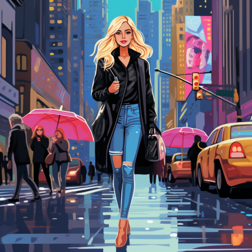 A cartoon-style digital illustration of a caucasian woman with long blonde hair and natural makeup highlighted by pink lipstick, walking down a busy city street in the rain. She is dressed in a blue sweater and black pants. She is wearing stylish boots. She is confidently holding an umbrella that shields her from the rain, with the full outfit visible from hair to shoes, embodying a sense of delight in the rainy ambiance. Please create the image in a portrait 9:16 aspect ratio