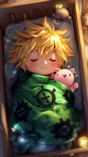 Baby Meliodas from Seven Deadly Sins in an ultra-cute chibi style, peacefully sleeping in a small wooden crib, wrapped in a soft green and black blanket with tiny sin symbols. His chubby cheeks are blushing, and his distinctive spiky blonde hair is styled adorably, with his characteristic little horns peeking through. A gentle glow of magical energy surrounds him like a protective aura. In the crib, he cuddles a plush version of his Demon Sword as seen in the anime, and a small pink pig plush toy. The crib is surrounded by small plush toys shaped like magical items and symbols from the series, with pastel colors creating a warm, cozy atmosphere. 8K, HDR, high quality, --ar 9:16