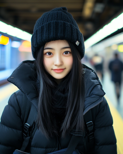 Hyperrealism photo, Japanese 17-year-old girl, very lovely, winter clothes, smile face, squat pose, face close-up, subway platform, subway, 8k,uhd --ar 4:5 --style raw --stylize 50 --v 6.1