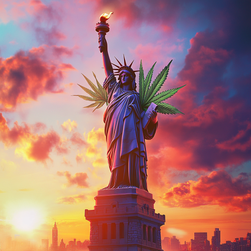 high quality, photorealistic detailed photograph taken with a DSLR camera, vibrant colors, photo quality, photograph of the statue of liberty, in place of her normal crown is a crown of cannabis leaves and a large cannabis leaf on the top of her torch, bright sunrise in the background