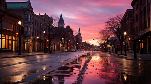 Downtown St. Louis south-facing intersection of Tucker Blvd and Lucas Ave, between the A.D. Brown Building and the Bogen Loft Apartments, winter sunrise with lavender-and-fuchsia-rose-colored clouds, Dutch-angle wide shot 16mm f/11 ISO100, --s 1000 --ar 16:9 --style raw