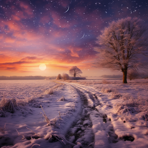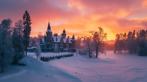 Karelian Castle palace In Winter landscape, cinematic, dramatic, sunrise --ar 16:9 --v 6.0