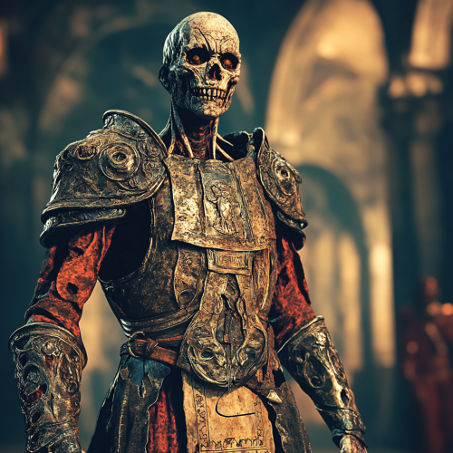 a well-preserved man who looks dead stands honorably and nobly while wearing highly detailed plate armor. The plate armor is stylized with scrolls, the afterlife, and visions of life and death in harmony. Cinematic quality. Highly detailed. Dynamic lighting and scene.