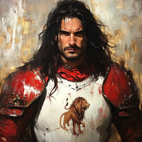 painting of a 40 year old warrior and knight in heavy plate armor. Red and white clothes with lioness on his chest plate. long dark hair, muscly stature, sharp facial features. clean-shaven and a scar to prove his experience.