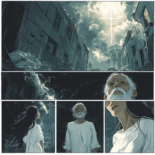 a webtoon scene, 9 panels, claude monet style, a girl in a white dress, a old man in rags, the old man talking the girl walking the street, A glowing cross appears in the sky and shines upon the old man.