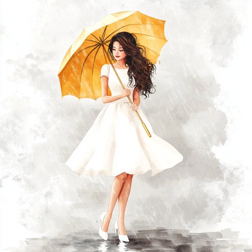 high detailed clipart watercolor full body of a beautiful girl with dark beautiful long thick hair, curls falling to the side, beautiful delicate makeup, standing, holding a beautiful yellow umbrella, spring rain, standing in the rain, woman in a beautiful white dress with white shoes, clipart sticker, spring rain, smile, soft colors, beautiful illustration with realistic details, high resolution, gray background