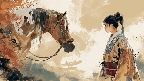 A beautiful horse with a japanese girl in a folk outfit, real illustration, --ar 16:9 --v 6.0