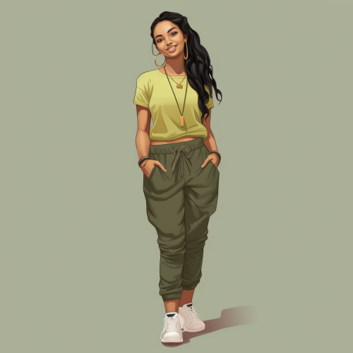 realistic Illustration of a confident east indian girl in a cartoon style. She's dressed in a olive green t-shirt, paired with black leggings, and black sneakers. She's smiling and has her hands in her pockets. She is wearing a gold chain.