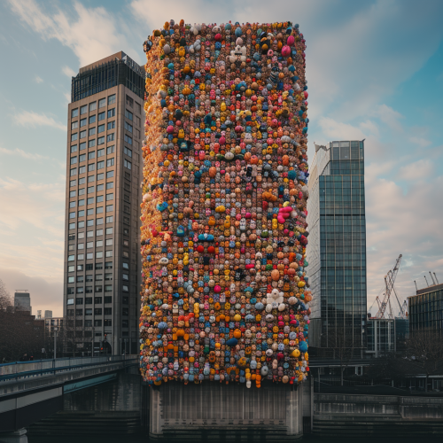 The exterior of the Barbican building in city london covered with millions of soft toys, a lot of colourful soft toys. main colours are orange, pink, sky blue and green. realistic photography. photorealistic. film texture. drone camera. Intricate Details, Hyper Details, Real Photography, UHD, Beautiful Environment, Beautiful Weather, Natural Lighting, UHD, 8K --v 6.0 --s 150