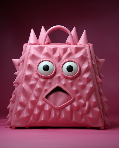 horrible monster shaped bag, terrible origami things crawling out of the monster bag, pink hues, neon, eerie, clean and sharp details, magical background, professional photography, shot with Hasselblad --ar 4:5 --s 250 --style raw