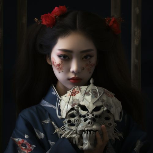 beautiful geisha holding hanya mask, photorealistic, cinematic style, highly detailed