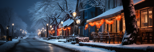 A beautiful snowy Christmas village at dusk