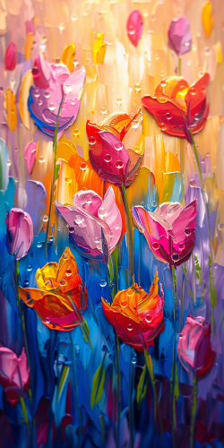 Van Gogh style painting of bold brush strokes of Sunset ambiance, close-up of dew kissed field of multicolored tulip garden in front --ar 1:2 --style raw --stylize 250 --v 6.0