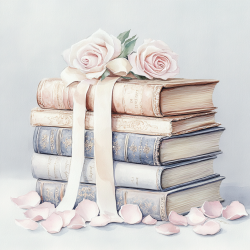 A stack of books with a blue ribbon and pink roses, digital art, clipart on a white background, in the shabby chic style, with sherry, silver, and gold colors, a romantic vintage design, with detailed and intricate details, high resolution, high definition, high quality, high detail, hyper-realistic, hyper-detailed, high-quality, hyper-realistic, clipart isolated on a white background.