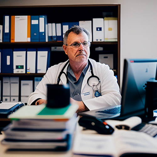 A doctor seated at his office desk. On the desk is an orderly stack of books. On that stack of books, the doctor has opened his laptop so he can talk with a patient. The important detail is the camera, on the top of his laptop screen is at eye level and he is looking directly at the camera. On the desk is an accessory keyboard and mouse. photo realistic --v 4