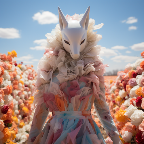 A field of flowers on a sunny spring day, I want you to imagine a beautiful woman in kimono wearing a fox mask waiting beautifully for you, petals flying upwards at an angle with great vigor, a flurry of flowers,best quality, hyper detailed, beautiful, woman, landscape photo, wide shot, full body shot, dutch angle shot, wide shot, circle composition, cute, vibrant academia, theatre academia, ultra realistic photo, motion blur, sunlight, wide-angle lens, slow shutter speed, dramatic contrast --s 250 --v 5.2