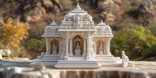 close up shot of open roof beautiful white indian temple. The temple is intricately detailed. Day time view. A ultra realistic photograph of The image was captured using a Canon EOS R5 with 50mm. --ar 16:9