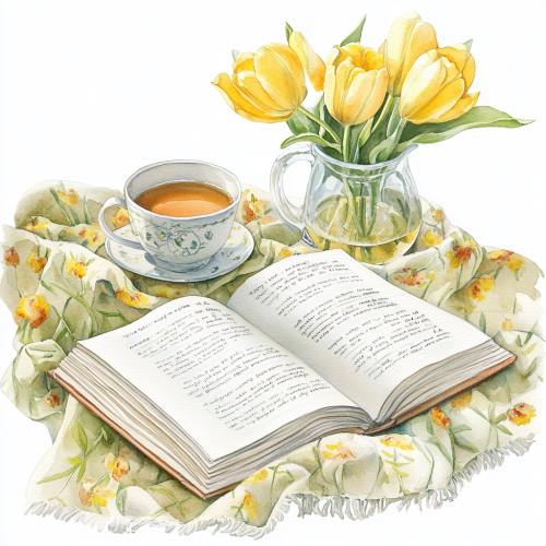 highly detailed watercolor clipart of a beautiful open journal book, next to it is a cup of tea in a mug and a glass vase with vibrant pastel pink tulips, on a spring blanket, naturally composed composition composition, soft colors, spring color palette, luxurious aesthetics, beautiful illustrations with realistic details, high resolution, white background