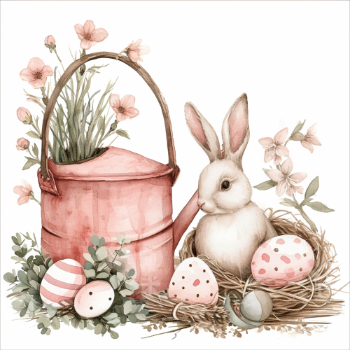 watercolor style, beautiful watercolor Easter watering can in Easter scenery drawing in shades of cream beige and dainty pink, very cute, clipart, isolated on white background --s 200 --chaos 20 --v 6.0