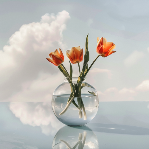 feminine poster, transpaprent glass tibe vase, tulips inside, in white clouds surface, clean white sky background, --v 6.0